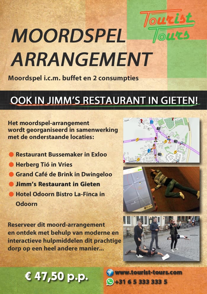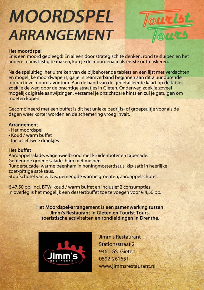 Home Uitjes in Drenthe Moordspel arrangement Jimms restaurant Gieten moordspel buffet en 2 consumpties