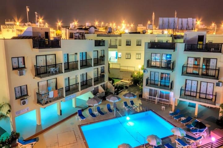 The facilities and services include restaurant, bar, terrace, swimming pool, business center, wireless Internet access, safe at the reception and reception 24 hour. Rooms features telephone, air conditioning, balcony, mini bar, kitchenette, dining area and bathroom. ** Please note that some of the above facilities may be closed due to weather / seasonal conditions. Address: 30 Demokratias Str, Ayia Napa, 5330. Ayia Napa, Cyprus.