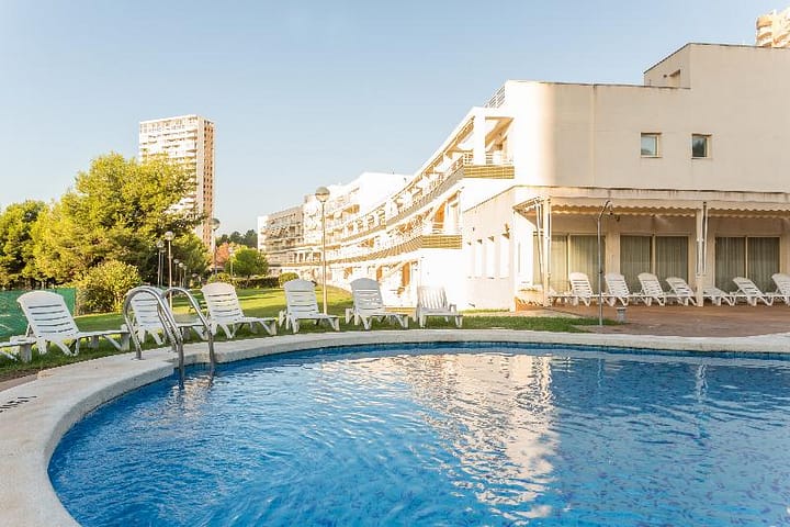 Facilities and services include wireless Internet access, parking, gym, swimming pool, indoor swimming pool and 24-hour reception. Apartments feature bathroom, TV, kitchenette, fridge, coffee maker, air conditioning, safe (extra charge), microwave, wireless Internet access (extra charge) and balcony/terrace. – Deposit on arrival 200 Euros. – Check in: from 17h. – Check Out: until 10h. **Note: Reception with limited opening hours. Please advise flight number and estimated arrival time when booking this hotel.** ** Consists of two buildings. It’s not possible to book a specific building.** ** Please note that some of the above facilities may be closed due to weather / seasonal conditions.** Address: Presidente Adolfo Suarez 7, 03502 Benidorm, Spain.