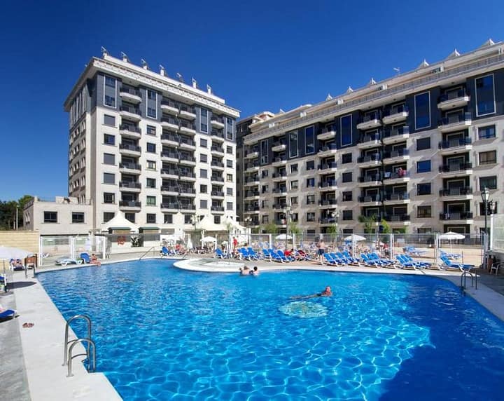Dit moderne appartementenhotel is handig gelegen in Fuengirola, op amper 20 minuten van het internationale vliegveld van Malaga. De gasten kunnen zwemmen en zonnebaden op het nabije blauwe-vlag-strand Los Boliches, een ontspannen wandeling maken langs de zeeboulevard en winkelen in het centrum van de stad. Er zijn tal van restaurants, cafes en bars in de onmiddellijke omgeving van het hotel, dat een eigen restaurant in buffetstijl heeft en ruime appartementen biedt met volledig uitgeruste keukens waarin de gasten zelf hun maaltijden kunnen bereiden. De appartementen met een slaapkamer hebben allemaal een balkon. De appartementen met twee slaapkamers hebben bovendien twee badkamers. Alle appartementen hebben gratis wifi, satelliet-tv en airconditioning. De gasten zullen ook het eigen zwembad voor volwassenen, het aparte kinderzwembad, het speelgebied en de beveiligde priveparking weten te waarderen. Dit is kortom de perfecte plaats voor een ontspannen zonvakantie.