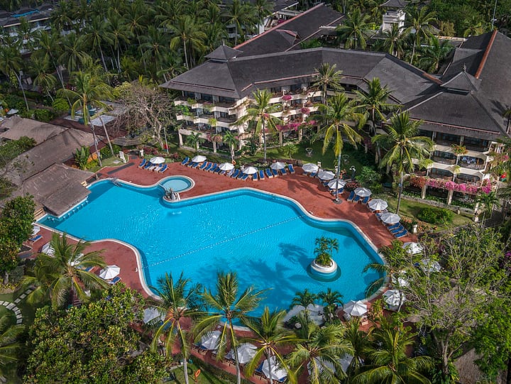 Dit hotel ligt direct aan het zandstrand van Sanur, een van de populairste gebieden van Bali. De perfecte uitvalsbasis om Bali, het beroemde eiland van de goden, bekend om zijn kleurrijke en levendige tempelfestivals, zonovergoten stranden, rollende branding, rustieke dorpjes en gebeeldhouwde rijstterrassen, te verkennen. Het hotel wordt omringd door 70.000 m2 aan tropische tuinen met veel oude bomen en kokospalmen.