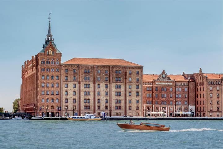 Het hotel biedt zijn gasten een atmosfeer van unieke charme en een fantastische locatie op het eiland Giudecca. De meest aantrekkelijke attracties van de stad, waaronder de Piazza San Marco en het Doge Paleis zijn met de watertaxi te bereiken. De gasten kunnen het Piazza San Marco en de Brug der Zuchten te voet in 20 minuten bereiken. De luchthaven Venetie Marco Polo is gemakkelijk bereikbaar met de watertaxi. Het hotel is gevestigd in een indrukwekkend rood, bakstenen gebouw uit de negentiende eeuw. Het heeft grote ramen en scherpe torens. Dit bijzondere hotel in Venetie is recent gerenoveerd en biedt zijn gasten vele exclusieve voorzieningen, waaronder een spa, een buitenbad op het dak, voortreffelijke businessfaciliteiten en verschillende bars en restaurants. Het is volledig voorzien van airconditioning en beschikt in totaal over 379 gastenkamers. Tot de verdere voorzieningen behoren een ontvangsthal met een 24 uur per dag geopende receptie en uitcheckservice, een wisselkantoor, een garderobe, een lift en een kapsalon. De kamers en suites bieden de gasten hoogwaardige elegantie en comfort en zijn voorzien van de modernste technologie. Pittoreske ramen, zorgvuldig gerestaureerde plafonds met houten balken, verfijnde Venetiaanse stoffen en marmeren badkamers garanderen de gasten een onvergetelijk verblijf. Een haardroger, een telefoon, een televisie, een minibar en internettoegang behoren tot de standaardvoorzieningen. Een verwarmd buitenbad en een spa zijn aanwezig op het terrein van het hotel. De (snack)bar aan het zwembad biedt verfrissingen. Vanaf het station Santa Lucia: Neem een Vaporetto waterbus of een watertaxi om bij Giudecca Eiland te komen. Hier is het hotel gevestigd.