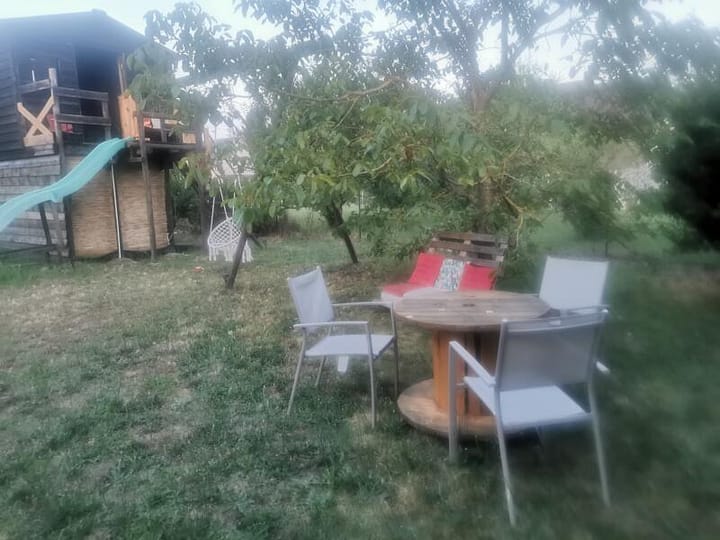 De hut is gemaakt van ruw hout, gebouwd door de familie aan de basis, het was een glijbaan-schommelportaal dat werd uitgebreid met een hut op hoogte voor onze kinderen. Het staat op palen met elektriciteit. Ze is authentiek en uniek. De tuinruimte wordt ter beschikking gesteld met de glijbaan onder verantwoordelijkheid van de ouders en de hangstoel… Het maakt deel uit van het landschap en past goed in ons land met een huis en een grote binnenplaats.