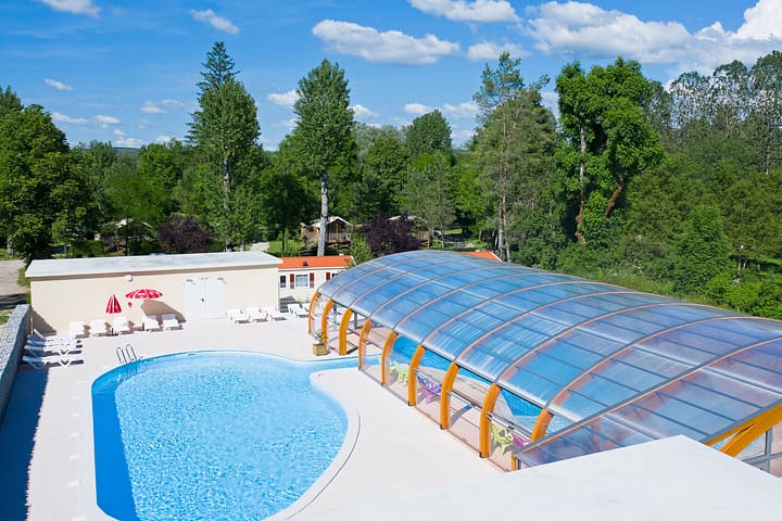 Vanaf de weg valt de camping nauwelijks op. Geen grote installaties of veel luxe, maar gewoon een rustig en groen terrein. Voor wat verkoeling en waterpret is er een fijn zwembad met overkapping. En vanaf je kampeerplek loop je ook zo naar de rivier met ligweide op de oever.