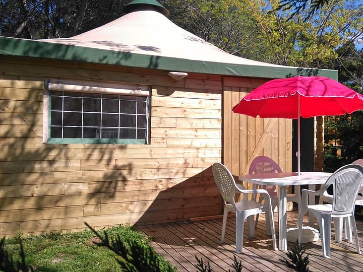 Een camping met 40 staanplaatsen, 32 verschillende soorten accommodatie, van ingerichte lodgetenten tot luxe stacaravans, en 8 kampeerplaatsen. Een klein eiland in mediterraan groen.