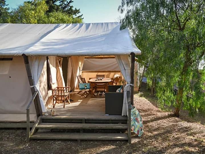 Camping Les Mimosas ligt tegenover de Gouden Eilanden en aan de voet van het massief van Maures. Het is geopend vanaf 1 april en ligt ook op 700 m van het grote zandstrand van Cavalière.