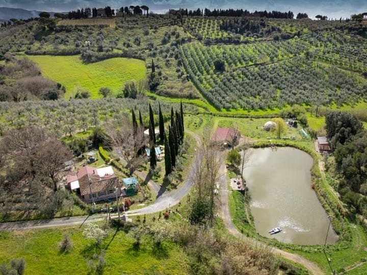 Agricamping aan het meer in de natuur van de Toscaanse heuvels met olijfbomen en cipressen op slechts enkele minuten van de zee, gelegen nabij de belangrijkste Toscaanse kunststeden zoals Volterra, Pisa en Florence. Ook per trein bereikbaar. De camping maakt deel uit van de boerderij waar boerderijdieren voorkomen zoals kippen, eenden, konijnen en Tibetaanse geiten en waar we typische producten en aromatische planten produceren. De staanplaatsen liggen op gras, in een ongerepte natuur waar u kunt genieten van de geluiden van de natuur. Op ongeveer 1,5 km afstand ligt het karakteristieke Etruskisch-middeleeuwse stadje Casale Marittimo (PI). Op ongeveer 5 km afstand ligt de stad Cecina, waar u alle voorzieningen kunt vinden, inclusief het treinstation. Agricamping voorzien van badkamer, warme douche, ontspanningsruimte en barbecue met tafel en banken waar u kunt genieten van uw eigen maaltijden en/of proeverijen van de boerderij. BBQ, Drinkwater, Warm water, Afwasbak, Eettafel, Vuurschaal, Zwemvijver of rivier, Hangmat, Sfeerverlichting, Toilet, Warme douche, Koude douche, Telefoon oplaadpunt, Huisdieren toegestaan, Dieren op het terrein, Parkeren op het terrein, Uitzicht op de velden, Uitzicht op de heuvels, Uitzicht op het meer, Uitzicht op het bos, Uitzicht op zonsopgang, Uitzicht op zonsondergang, Buiten zitgedeelte, Picknicktafel, Afvalverwerking, Mobiele ontvangst, Barrièrevrije toegang tot toilet