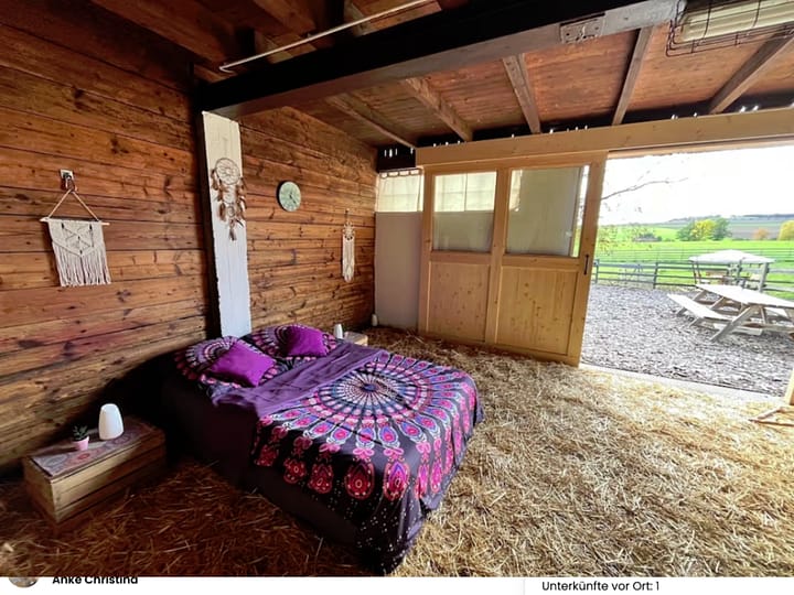 Een onvergetelijke belevenis: overnacht in onze prachtige alpacalounge in de stal, met paarden en alpaca’s als buren, of met uw eigen camper op onze staanplaats met uitzicht op de natuur en de dieren. Onze boerderij is idyllisch gelegen, omgeven door velden, bossen en weilanden, op een afgelegen locatie ongeveer 300 meter buiten het dorp. De Alpaca Lounge, gebouwd in 2024, is een voormalige paardenstal en het unieke stalkarakter is bewust behouden gebleven. De lounge is licht en schoon en biedt een prachtig uitzicht op de omringende natuur en de dieren. De lounge bevindt zich direct naast de alpacastal en vanuit daar kunt u de alpaca’s door een raam observeren. Voor gasten die overnachten in de Alpaca Lounge: Overdag kunt u ongestoord de alpaca’s in de wei observeren, door onze bibliotheek snuffelen, een ijsje eten, koffie drinken of, als u een extra tour boekt, gaan wandelen met onze alpaca’s. Een klein ontbijt kan worden geboekt en bij mooi weer kunt u buiten in de Alpaca Lounge zitten. ’s Avonds kunt u gebruikmaken van onze barbecueplek (vuurschaal) en vanaf de strandstoelen bij het kampvuur de zonsondergang bewonderen. De barbecueplek grenst aan de binnenplaats, op een plek waar andere kampeerders kunnen samenkomen. Slaapgelegenheid: Een groot luchtbed voor twee volwassenen op een strovloer. Het bed is comfortabel opgemaakt met dekbedden en kussens. In de zomer kunt u ’s nachts de grote houten poort open laten staan en luisteren naar de geluiden van de nacht. Een gevoel van avontuur en vrijheid. Kampeerders die op onze camping overnachten, kunnen geen gebruik maken van de faciliteiten van de boerderij. Deze zijn uitsluitend gereserveerd voor overnachtende gasten in de Alpaca Lounge. Een exclusieve, begeleide alpacawandeling voor twee personen kunt u vooraf boeken, afhankelijk van de beschikbaarheid. De boerderijwinkel met alpacaproducten en cadeau-ideeën is op aanvraag geopend en nodigt u uit om rond te snuffelen. Kinderen en honden zijn niet toegestaan op het terrein. Roken is nergens op de boerderij toegestaan, behalve op de aangrenzende barbecueplek. BBQ, Vuurschaal, Brandhout beschikbaar, Parkeren op het terrein, Uitzicht op de velden, Uitzicht op het bos, Uitzicht op zonsopgang, Uitzicht op zonsondergang, Buiten zitgedeelte, Picknicktafel, Mobiele ontvangst, Barrièrevrije toegang tot de kampeerplaats