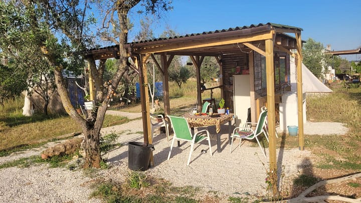 Ons Casa Santa Lucia is een romantisch, vredig plekje, omgeven door eindeloze olijfgaarden. Een plek om te ontspannen. De zee is ongeveer 35 minuten fietsen en het stadje is ongeveer 20 minuten rijden. Van donderdag tot en met zaterdag is er een boerderij met heerlijke producten van eigen bodem op 10 minuten loopafstand. Onze moestuin is momenteel in ontwikkeling. We zijn nog bezig met de inrichting: vooralsnog is er een goed uitgeruste camperkeuken met gasfornuis, warm water, magnetron, koelkast, wifi en een gemeenschappelijke zithoek. De buitenbadkamer (te koud om in de winter te douchen) heeft een warme douche, een composttoilet en een wastafel met koud water. Daarnaast zijn er al twee buitenwastafels om tanden te poetsen. Er is een urinoir in aanbouw (zodat iedereen in de zomer niet tegen de bomen plast – anders stinkt het) en er wordt momenteel ook een buitendouche gebouwd. Er is wel elektriciteit, maar de airco/verwarming werkt meestal niet, omdat we hier op het platteland maar 6 kW van het openbare net kunnen krijgen. Dat is de druppel. Als u wilt wassen, kunt u tegen betaling gebruik maken van onze wasmachine BBQ, Drinkwater, Warm water, Gasfornuis, Afwasbak, Keuken, Basis kookmaterialen, Koelkast, Borden en bestek, Koffie en thee, Eettafel, Koffiezetapparaat, Brandhout beschikbaar, WiFi, Sfeerverlichting, Toilet, Warme douche, Koude douche, Elektriciteit, Telefoon oplaadpunt, RV elektriciteit, Huisdieren toegestaan, Overdekte keuken, Regenschuilplaats, Dieren op het terrein, Parkeren op het terrein, Uitzicht op de velden, Buiten zitgedeelte, Picknicktafel, Afvalverwerking, Mobiele ontvangst
