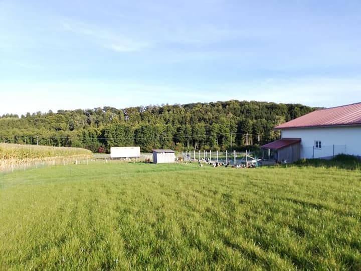 De kampeerplaats ligt op een weiland direct bij de boerderij, omgeven door velden en bossen met een prachtig uitzicht over de Isarvallei in Neder-Beieren. Er is genoeg te ontdekken op onze kippenboerderij. Er is altijd wel iets te beleven op onze velden en weiden, en dat is vooral voor kinderen spannend. We kijken ernaar uit om dat met jullie te delen. Vanaf het plein kunt u prachtige wandelingen maken. De parkeerplaats ligt midden in de groene weide en biedt een prachtig uitzicht. Bij slecht weer is er ook de mogelijkheid om naast de weide te parkeren, aan de verharde wegrand. De plek is goed bereikbaar en er is voldoende ruimte om te draaien. Drinkwater, Open haard, Elektriciteit, Huisdieren toegestaan, Buiten zitgedeelte