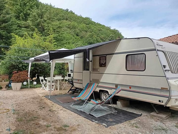 Ik bied een stacaravan aan voor een stel, in mijn aangelegde tuin, met elektriciteit. Wifi De caravan is uitgerust met een ventilator, verwarming, koelkast, bed van 150 cm, buitenkeuken, tafel en stoelen en horren. Het water bevindt zich voor de caravan. Er is een sanitaire ruimte voor u gereserveerd. Tot uw beschikking staan een gemeenschappelijk zwembad, tafeltennistafel, barbecue en tuin. Ontbijt, massages en creatieve workshops beschikbaar op reservering. Wij liggen vlakbij het Bamboebos, de Trabuc-grot, het Woestijnmuseum, de Kleine Cevennen-trein…