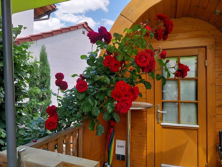 Glamping onder kasteel Hambach: Dit pareltje is gelegen op het stacaravanterrein van een al lang bestaande wijnmakerij, direct aan de wijngaarden en wandelpaden van de omgeving en bij kasteel Hambach