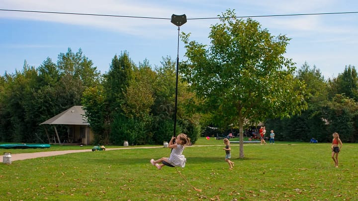 Naast koeien vind je hier geiten, honden, kalfjes, katten, kippen, koeien, konijnen en zelfs pony’s: er zijn hier heel wat dieren die de kids kunnen verzorgen of waar ze mee kunnen knuffelen. Het is een waar paradijs voor kleine en ook grote dierenvrienden. En na al het harde werk op de boerderij en het verzorgen van de dieren, kun je hier spelen tot je niet meer kunt! Wat dacht je van een mega boomhut met kabelbaan, hooischuur, modderkeuken, schommels, skelters, trampolines en een water- en zandspeelplaats! En het mooiste is nog dat de luxe tenten verdeeld staan over 4 knusse veldjes die grenzen aan de grote speelweide en dierenweide. De kids zijn dus nooit ver weg als jij lekker aan het relaxen bent met een boek of een drankje bij de tent.