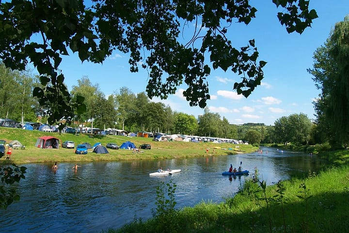 Veel bomen en op gras gelegen afgebakende plaatsen. Vanaf de camping loopt men over de brug zo Luxemburg binnen Echternach in! (Heel leuk.)