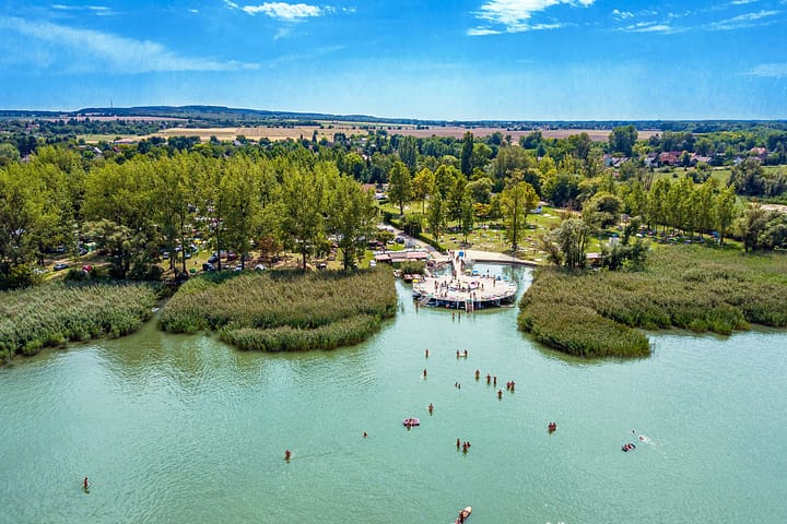 Mooie, ruime naturistencamping even buiten het dorp en mooi aan het meer gelegen in een heel rustig natuurgebied. Opvallend is de enorme zonneweide en het kunstmatige eiland. Restaurant en strandbar. Het themabad Héviz is dichtbij.