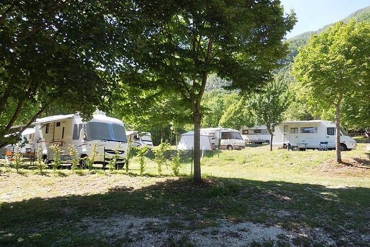 Rustige, kleinschalige terrassencamping in de Abruzzen, gelegen naast een riviertje in de bergen, met panoramisch uitzicht. Gratis wifi en plekken met of zonder schaduw. Ideale plek om bij te komen van het drukke Rome of Pompeï.