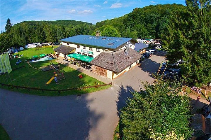 Camping die fungeert als doorreiscamping, waar je van alle comfort kunt genieten tijdens een reisstop. Ruime toerplaatsen voor camper of caravan. Een gezellige en mooi ingerichte bar. Aan het fornuis de eigenaar, en een perfect ‘Luxemburgs’ pintje wordt door de eigenaresse voor jou getapt.