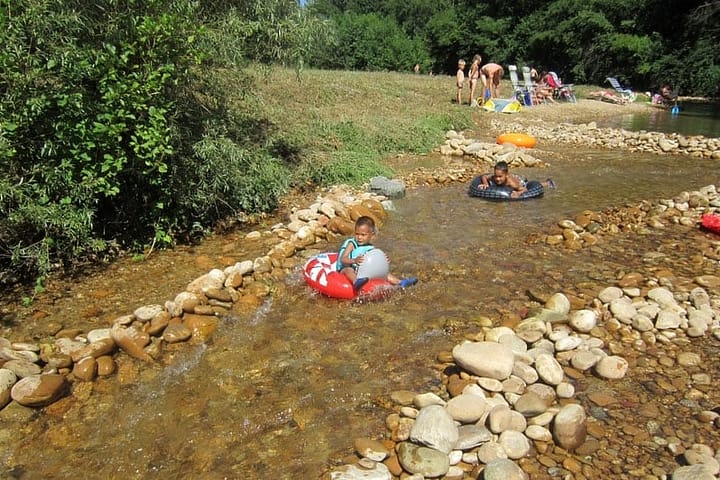Kleine camping met afgebakende, schaduwrijke plaatsen. Een riviertje stroomt naast het terrein. kleinschalig , aanbevolen voor zij die rust zoeken