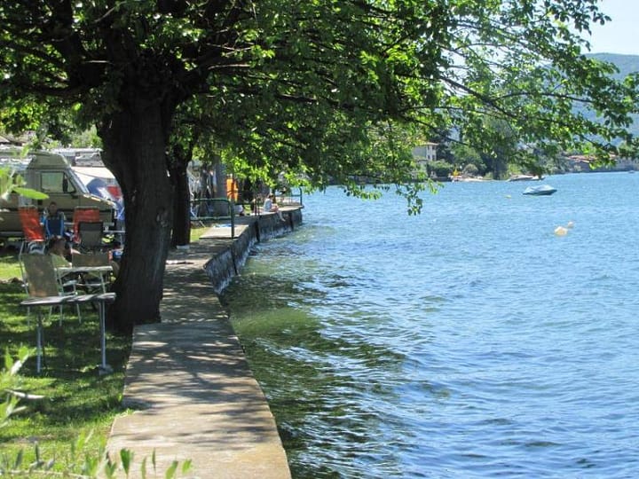 De camping ligt aan het Iséomeer. De toeristische staanplaatsen liggen in de schaduw van verschillende soorten loofbomen en worden gescheiden door enkele heggen. Aan de andere zijde liggen een spoorlijn en een weg, waarvan de kampeerder geluidshinder kan ondervinden. Het terrein is autovrij en de auto's kunnen worden geparkeerd op een eigen afgesloten parkeerterrein. Er is een ligweide met een loungegedeelte met tafels, stoelen en banken. Het water is via een trapje te bereiken.