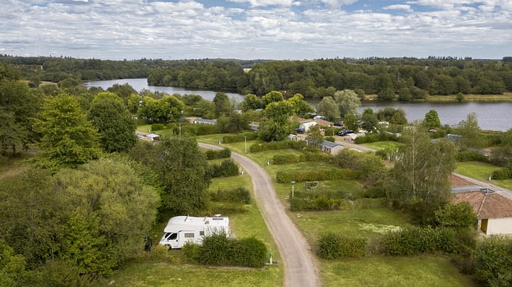 Het glooiende, wat ruige, groene terrein ligt direct aan een meer, waar ook gasten van buitenaf terecht kunnen. De huuraccommodaties vind je aan beide zijkanten van de camping. De staanplaatsen op de terrassen worden gescheiden door hoge heggen, liggen op gras en hebben schaduw van loofbomen. Je kunt zwemmen in het binnenbad of het openluchtzwembad, waar ook een kleuterbad bij is, evenals in het bewaakte meer, waar veel watersportmogelijkheden zijn. Zonnen kun je op het zandstrand met ligweide.