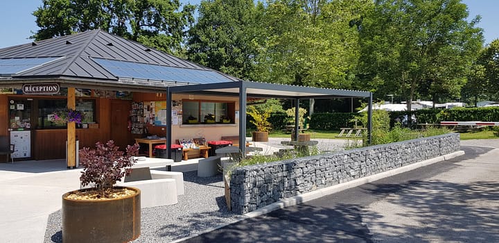 Dit terrein ligt op enkele honderden meters van een meer met volop watersportmogelijkheden. De toeristische staanplaatsen liggen soms aan straatjes bij elkaar, soms geïsoleerd tussen de huuraccommodaties. Ze kijken uit op de vaste plaatsen. De ondergrond is gras. Er is voldoende schaduw, enkele struiken zorgen voor afbakening. Verspreid over het terrein staan enkele fitnesstoestellen. De camping heeft een broodservice.
