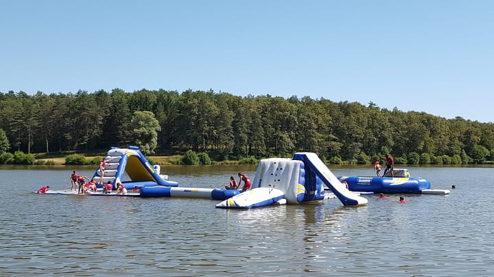 Het langgerekte terrein ligt te midden van een bosrijke en glooiende omgeving. De terrassencamping is omzoomd door hoge bomen en de plaatsen zijn gescheiden door beplanting en bieden een open karakter. De camping biedt stacaravans en tenten zonder sanitair, er zijn slechts enkele kampeerplaatsen. In het nabij gelegen meer worden in het hoogseizoen opblaasbare speeltoestellen, zoals glijbaan, trampoline en zelfs katapult geplaatst. Vanuit de camping kan er in het meer gevist worden.