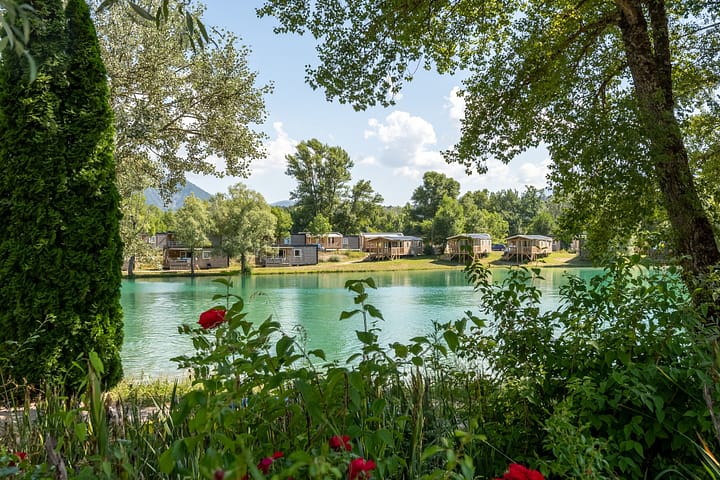 Aan een meer met zandstrand gelegen terrein, midden in het natuurpark van de Vercors. Meerdere van de schaduwrijke en afgebakende staanplaatsen kijken uit op de bergen. Het is toegestaan om in het meer te zwemmen en er is een verwarmd overdekt zwembad. Jeu-des boules, badminton, volleybal, waterfietsen, kanoën en vissen vormen het sportaanbod. Langs het meertje ligt een aantal strandjes bestaande uit gras en zand.