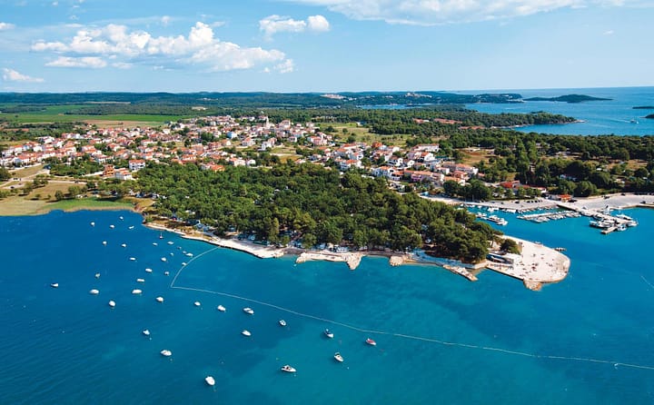 De camping ligt pal naast het kleine vissersdorpje Funtana, op 7 km afstand van Porec. Het kampeerterrein ligt in een dennenbos en grenst direct aan een strandje. Er is vanaf de staanplaatsen aan zee ook zicht op het mooie haventje. Het 300 m lange rotsstrand bestaat uit met vlakke betonplaten, die met natuursteen bedekt zijn, en smalle grasstroken met kleine baaitjes met grind.