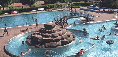 De met bomen begroeide camping ligt in het kuuroord Bad Liebenzell. De staanplaatsen liggen aan rechte paden. Het grote gemeente zwembad direct naast de camping is vrij toegankelijk voor de campinggasten. Voor kinderen is er een speeltuin. Campinggasten krijgen een gratis openbaarvervoerkaart voor het Zwarte Woud en omgeving. Op gehoorsafstand ligt een spoorlijn (geen treinen tussen 24 uur en 5 uur). In Bad Liebenzell is een kunstijsbaan.