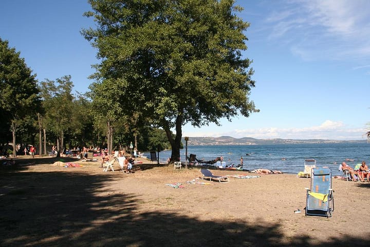 Deze licht glooiende camping die fraai is ingepast in de natuurlijke omgeving, heeft autovrije en afgebakende staanplaatsen met veel schaduw van loofbomen. Achter op het terrein zijn auto's toegestaan en is minder beschutting. Het rechthoekige zwembad ligt vooraan op het terrein en is 2 m diep, het kleuterbad 40 cm. Er is een zandstrand van ca. 200 m lang met aangrenzend een ligweide. Het water wordt langzaam dieper. Er is geen toezicht, maar het restaurant ligt nabij, waar een ruim terras is.