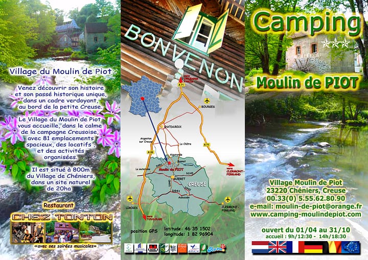 De ruim opgezette camping ligt op een heuvelachtig terrein nabij een oude watermolen. De kampeervelden zijn ruim met aan de randen de staanplaatsen. De camping ligt dicht bij de ‘La Petite Creuse’, waarin je kunt vissen, baden en dammetjes bouwen. Op de camping worden workshops gegeven, zoals pottenbakken, schilderen en een aantal sportieve activiteiten georganiseerd zoals kanoën, boogschieten, klimmen en mountainbiken.