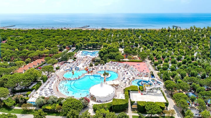 De monden van de drie hoge glijbanen spuwen met hoge snelheid de kinderen en volwassenen uit. Dit plezier tekent het zwemcomplex, met ook een groot bassin waarin je rond het eiland kan zwemmen. Voor de kleintjes zijn eveneens diverse glijbanen, uitmondend in het ondiepe bad (70 cm diep) én een spraypark (kinderen tot 1 m lengte) De parkachtige camping heeft staanplaatsen tot 120 m² over het algemeen onder bomen en veel huuraccommodaties. Het strand heeft een speeltuin, ligbedden en parasols.