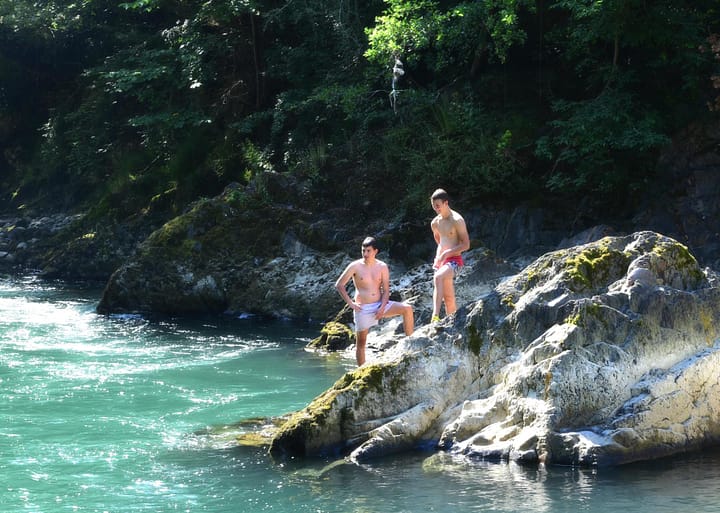 De camping strekt zich uit langs de Saison, die hier wild kan stromen. De staanplaatsen bevinden zich onder grote, dichte bomen, deels met uitzicht over de rivier. Deze is via een kleine helling en een trap te bereiken en geschikt om te zonnen. Er is een kiezelstrand, een plateau en enkele stenen om te zitten. Er is een zwembad van 9 x 3 m, met parasols en ligstoelen. De camping heeft een bar en een snackbar. Op 1,5 km ligt Mauléon met horeca, winkels, citadel en kasteel.