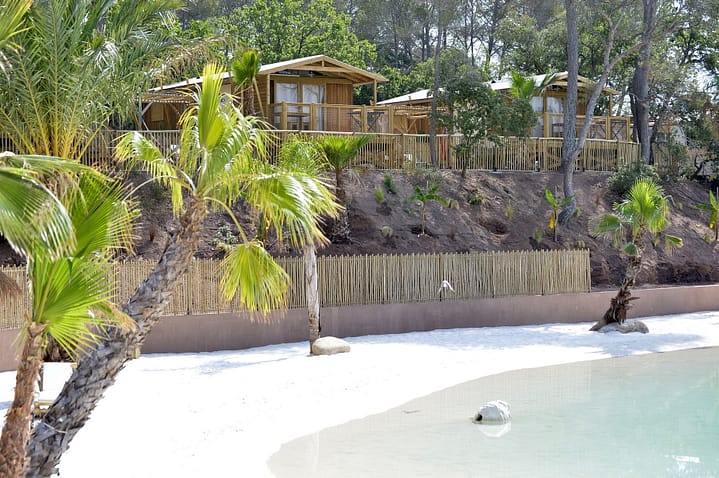 De ruime camping ligt op twee heuvels waartussen een dal met een beekje. Ooit was hier een steengroeve van de Romeinen. De staanplaatsen liggen goed beschut tussen de natuurlijke begroeiing op een hoger gelegen plateau, onder hoge bomen. Caravans mogen niet langer zijn dan 7 m. Er is een zwembadencomplex en een fraaie lagune met erom heen een zandstrand. De sport- en speelvoorzieningen, de winkel en het restaurant liggen in het dal. In het hoogseizoen rijdt een gratis bus naar het strand.