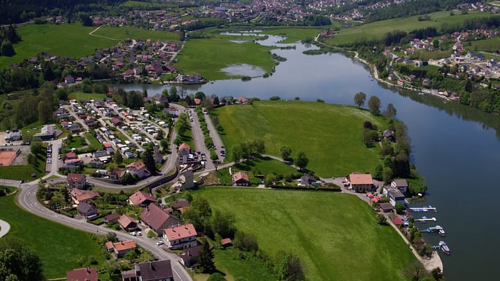 Fraai gelegen terrassencamping boven Lac de Brenets. De staanplaatsen, vaak verstevigd, bieden uitzicht op het meer of de omringende bergen. Vanaf de camping is het meer te bereiken. Het centraal gelegen sanitair is bereikbaar via een hellende weg of trappen. Kano's, roei- en motorboten, waterfietsen, tennisbanen (naast de camping) en rackets zijn te huur. Er zijn veel zwem-, fiets- en wandelmogelijkheden.