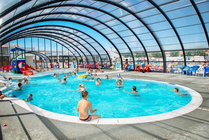Je vindt de langgerekte groene camping met toeristische staanplaatsen op gras gegroepeerd op het rechterdeel van het terrein. Ze liggen aan rechte straatjes gescheiden door hoge heggen met schaduw van loof- en naaldbomen. De talrijke stacaravans bevinden zich op het linkerdeel. Vooraan lokt het zwemcomplex met een buitenbad, jacuzzi en drie waterglijbanen. Naast het zwembad met schuifdak is er een kleuterbad met glijbaantjes. De sporters kunnen naar de fitness, tennisbaan of multisportterrein.
