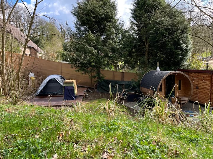 Op een bebost en glooiend terrein van 25×50 meter ontmoet je mensen, katten, konijnen en alle andere kleine wezens van de tuin, allemaal in vrijheid. Je wordt ondergebracht onder de sterren op ons platform van 40 m² naast het huis of je kunt je tent (of onze huur) opzetten op ons houten platform van 9 m² of in de tuin. ‘S Nachts ervaar je een manier van slapen met de natuur zoals je nog nooit hebt meegemaakt. Overdag doe je artistieke of natuuractiviteiten waardoor je met plezier delen van jezelf ontdekt die je niet eens vermoedde. Aanvullende prijsinformatie: Minimum verblijfstarief ter plaatse: €50 voor 1 of 2 personen per nacht. Dan 12 € per extra persoon. 10% korting bij een verblijf van 2 nachten. Voorbeeld: Kom je om 5 uur voor één nacht, dan is dat 50+ (3×12) = 96€, ofwel 19,20€/persoon. Alle prijzen zijn exclusief btw Aanvullende diensten: Indien u de schoonmaak niet betaalt: 60€ Sauna en wellness: €40 voor 2 uur (max 4 personen, reparatie/schoonmaak door u, hout ter plaatse voorzien) Brunch bij ons: 18€/pers (eieren van onze kippen, brood, cornflakes, huisgemaakte yoghurt, fristouille van wilde planten,… Alles is natuurlijk goed en biologisch.) Barbecue en/of gasfornuis: € 15/dag Muskietennet: 15€/1 dag, 20€/2 dagen Activiteiten: Outdoor yoga, meditatie, meditatieve dans van de chakra’s, beeldhouwen, creatief schrijven, schilderen, spel van vrouwelijkheid, spel van medicijnkaarten, paardrijden. De hele plaats is in eco-constructie. Zie de Youtube playlist met de trefwoorden ’trance tan dance playlist ecoconstruction and nature life’ Voor meer informatie: zie de website genaamd Dana’s Glade BBQ, Drinkwater, Gasfornuis, Vuurkorf, Sauna, Toilet, Koude douche, Elektriciteit, Telefoon oplaadpunt, Elektrische kachel, Huisdieren toegestaan, Regenschuilplaats, Picknicktafel
