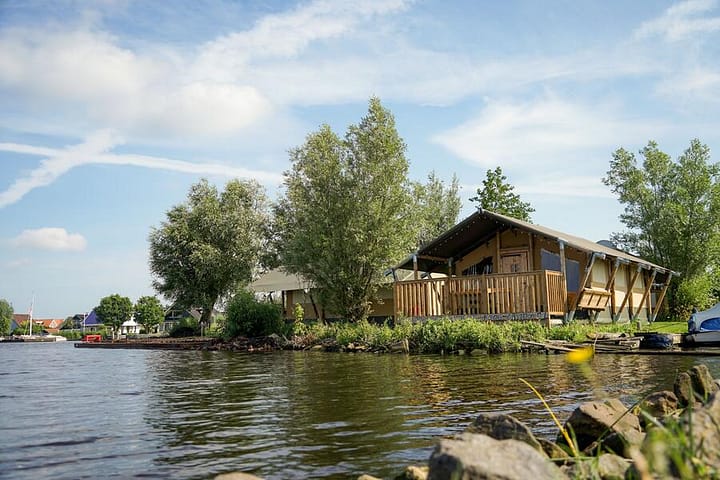 De safaritenten zijn gelegen aan en met uitzicht op de Kagerplassen en Kagerpolder.