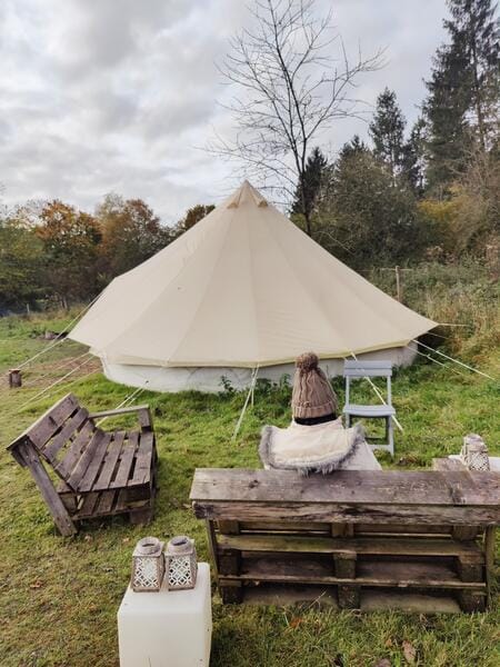 Waaraan kan je je als kampeerder, naast de prachtige natuur en de rustgevende alpaca’s, op onze plek verwachten? In de tent vind je zeker en vast wat luxe terug: goede bedden, zalige dekens, mooie inrichting en de nodige ruimte zodat er ook binnen aan tafel kan zitten! Eten klaarmaken kan op een gasvuurtje buiten, barbecue (aanwezig) of je kan grillen op een kampvuur. (vuurschaal aanwezig) Elke tent heeft buiten zitzetels en een picknicktafel. Zit je buiten bij je tent, dan heb je een prachtig uitzicht op de weides en bossen bij de Dijle-vallei, bovendien zullen de nieuwsgierige alpaca’s vast en zeker eens tot bij jullie komen. Ik maak zeker tijd voor jullie vrij opdat jullie met de rustgevende beestjes kunnen kennismaken.
