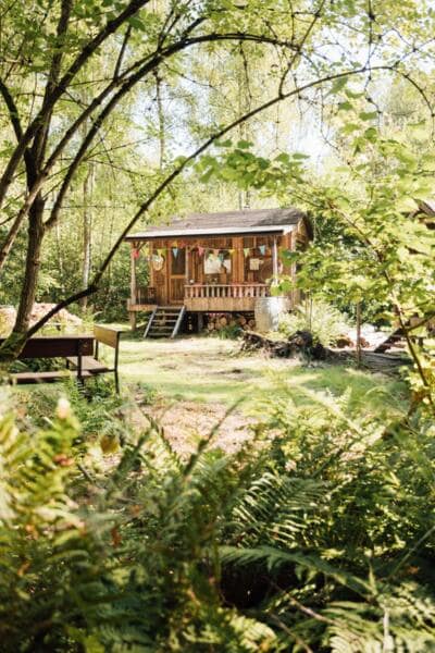 Rond het gezellig open vuur op het middenpleintje staan 3 authentieke houten huisjes op wielen en een buitenkeuken, huisgemaakt uit gerecycleerd materiaal.