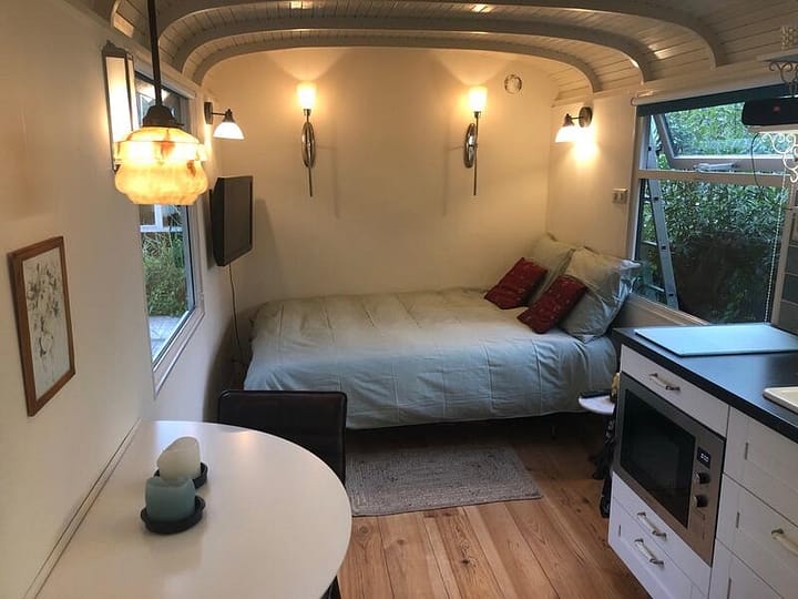 Dit luxe Tiny House voor twee personen ligt aan de rand van recreatiegebied Spaarnwoude, nabij Spaarndam, Haarlem en Amsterdam. U verblijft u in een pas gerenoveerde pipowagen met een eigen badkamer voorzien van vloerverwarming, een ruime douche, een wastafel en toilet. Via Chromecast kunt u uw favoriete programma’s op het televisiescherm streamen. U heeft een heerlijke tuin tot uw beschikking (gedeeld met de woonarkbewoners) met direct toegang tot zwemwater, een kampvuurplaats en een jacuzzi (alleen in het zomerseizoen, vergoeding voor gebruik € 17,50, ter plaatse te betalen).