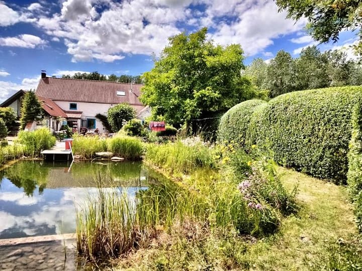 De tuin heeft vele wegjes en hoekjes en aan de fruitbomen is het heerlijk kamperen. In de zomer kan je een duikje nemen in de zwemvijver. BBQ, Drinkwater, Vuurkorf, Toilet, Warme douche, Telefoon oplaadpunt, Picknicktafel