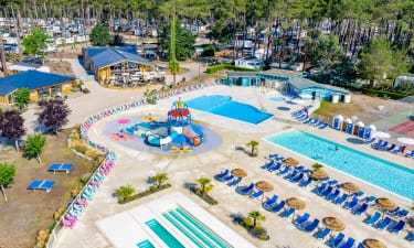 Camping bij , Zuid-West Frankrijk in Frankrijk. Onder hoge pijnbomen, met groot zwembad en spraypark. 5 km van zee, neem de gratis shuttlebus. Animatie voor kids van 1-14 jaar. Wie beklimt het snelst de hoogste duin van Frankrijk?.