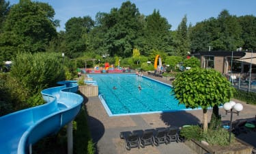 Camping bij , Gelderland in Nederland. Aan de rand van de Hoge Veluwe. Buitenzwembad met lange glijbaan. BMX crossbaan. Animatie tijdens schoolvakanties.