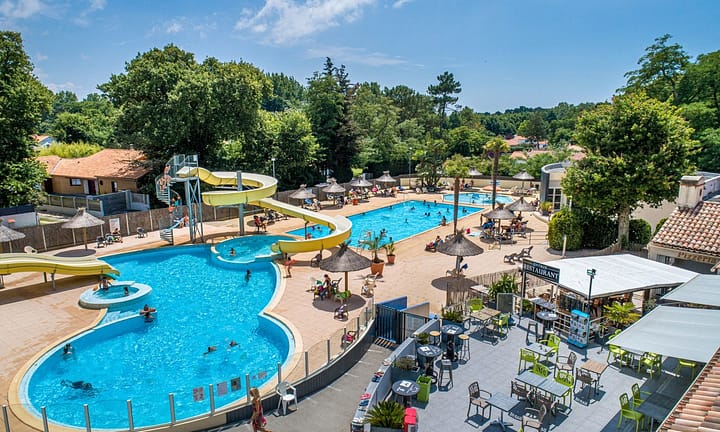 Camping bij St. Hilaire de Riez, Vendée in Frankrijk. Zwembad met glijbanen, verwarmd en overdekt. Animatie voor jong en oud. Op maar 4 kilometer van het strand. Vlakbij St. Hilaire-de-Riez.