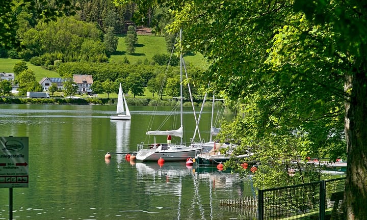 Camping bij Meschede, Noordrijn-Westfalen in Duitsland. Overdekt en verwarmd zwembad met sauna. Animatieteam in het hoogseizoen. Direct aan het Hennemeer. Ideaal voor een bezoek aan Winterberg of Willingen.