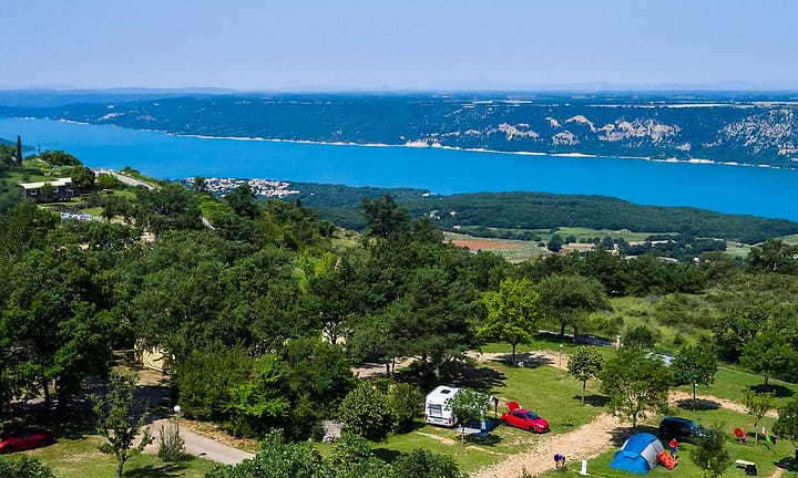 Camping bij , Provence in Frankrijk. Geweldig uitzicht over het Lac de Ste. Croix. Jacuzzi en restaurant. Vele watersportmogelijkheden op het meer. Twee minuten lopen naar dorpje Aiguines.