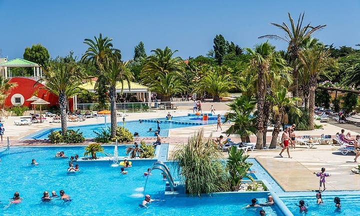 Camping bij , Languedoc-Roussillon in Frankrijk. Verwarmde zwembaden met glijbanen en kinderspeelbad. Op 1 km van zee en 1,5 km van stadje le Barcarès. Rustige camping met tropische uitstraling door palmbomen. Uitstapjes naar Perpignan en de Pyreneeën..