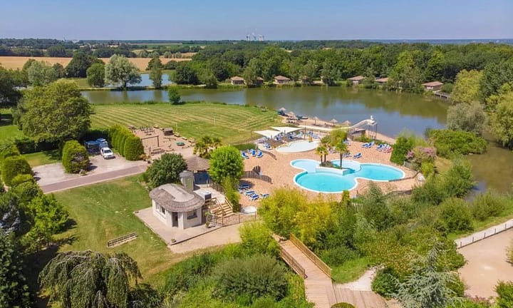 Camping bij , Loire-vallei in Frankrijk. Vijfsterren familiecamping. Buitenbad met glijbanen, binnenspeelbad. Meertjes om te vissen en te kanoën. Bezoek vele kastelen, bv Sully-sur-Loire.