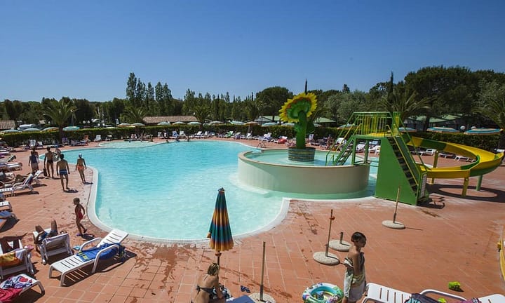 Camping bij Marina di Bibbona, Toscane in Italië. Kleine, gezellige camping aan Toscaanse kust. Speels zwembad met glijbaantje en waterval. 700 meter van het strand af. 2 visvijvers naast de camping.